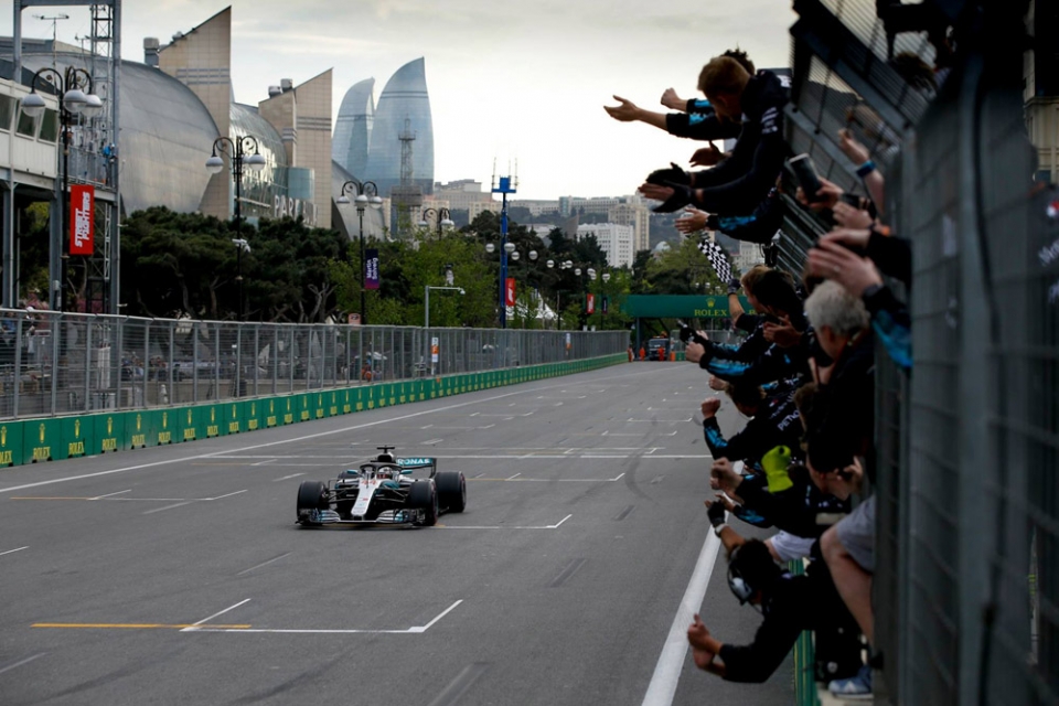 해밀턴은 29일 아제르바이젠 바쿠 시가지 서킷에서 열린 2018 F1 월드챔피언십 4차전에서 페라리의 키미 라이코넨과 포스인디아팀의 세르지오 페레즈를 누르고 가장 먼저 피니시라인을 통과했다.