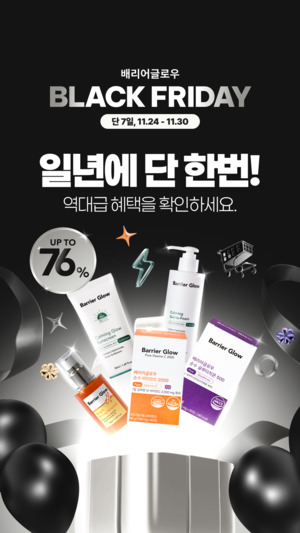 민감성 피부도 편안하게 사용할 수 있는 스킨케어 브랜드 배리어글로우(Barrier Glow)가 블랙프라이데이를 맞아 주요 제품을 대상으로 한정 특가 프로모션을 진행한다고 밝혔다.이번 블랙프라이데이는 1년에 한 번 진행되는 대규모 혜택 행사로 많은 소비자들이 관심을 보여온 베스트셀러 제품 △진정 폼나는 젤클렌저 △진정 광나는 선크림 △비타민 C 2000 △순수 글루타치온 500 △광토닝 앰플+순수 비타민C 2000 등 을 중심으로 특별 할인을 제공한다. 배리어글로우는 평소 민감성 피부 고객들의 의견과 니즈를 반영하여 부담 없이 사용할