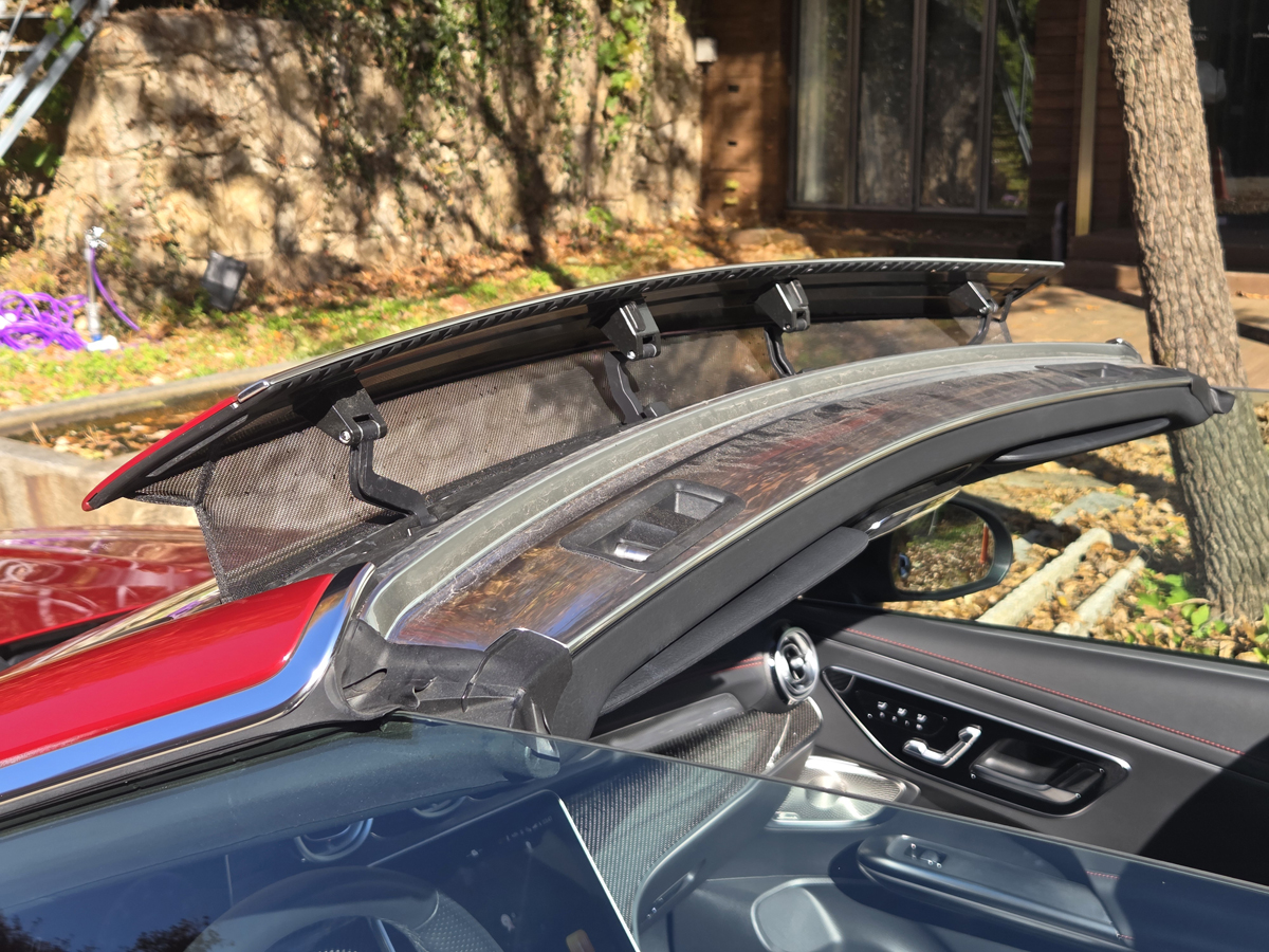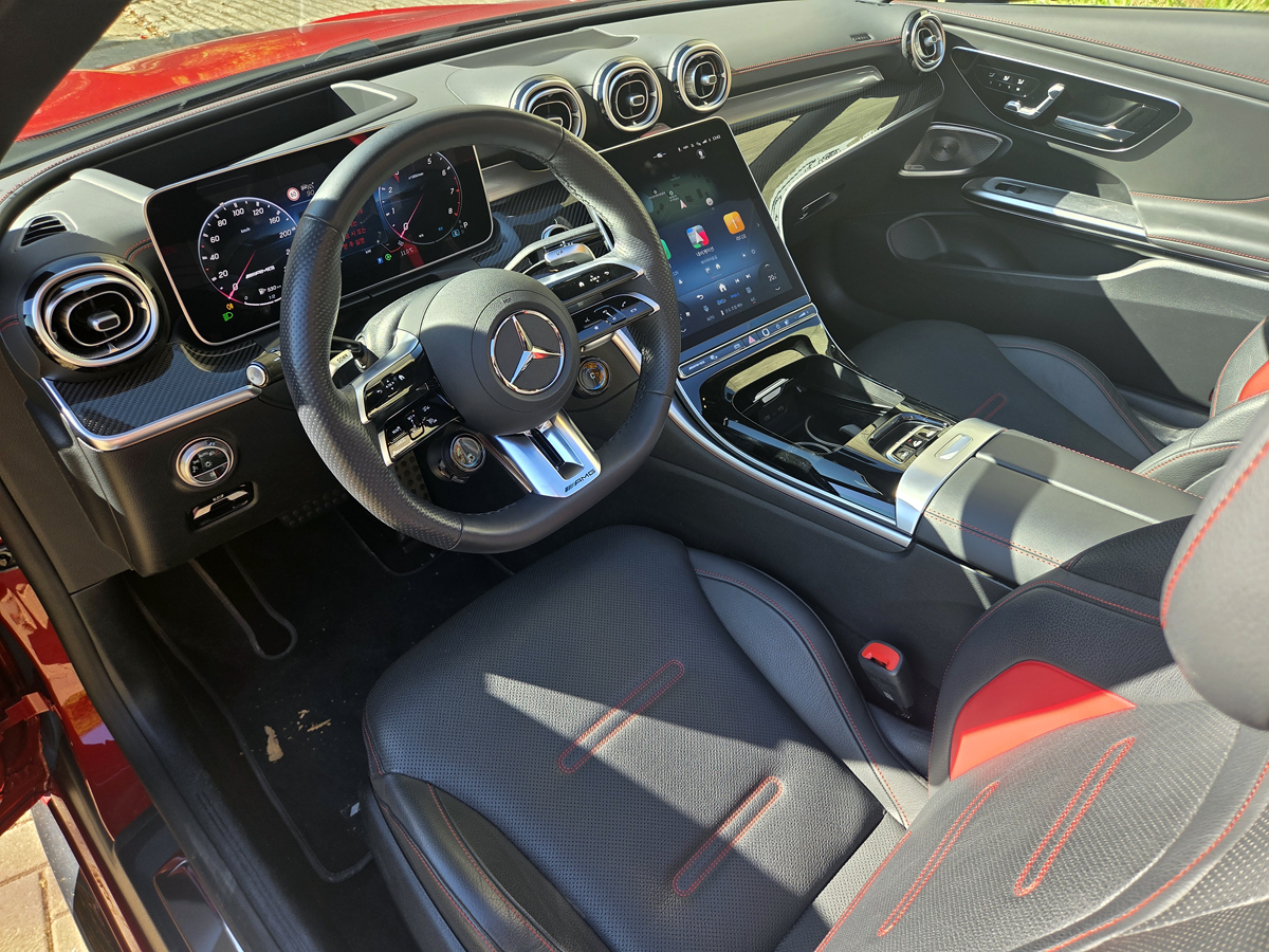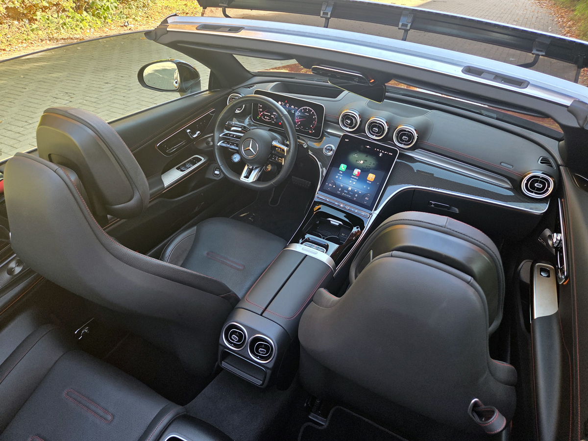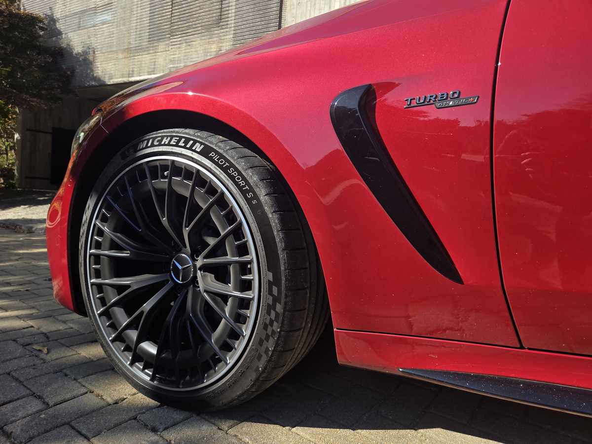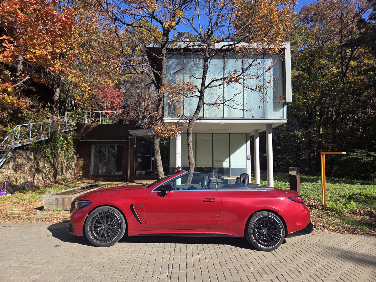 외관은 AMG 특유의 역동성과 카브리올레의 우아함이 적절히 섞여있다. A자형 프론트 스커트, 레드 브레이크 캘리퍼, 20인치 Y스포크 휠, 레드 컬러 소프트톱이 어우러져 존재감을 과시했다.