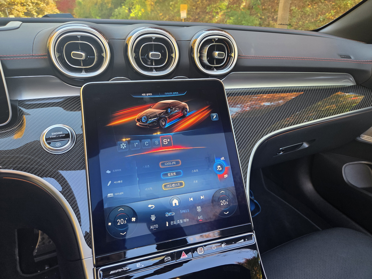 실내는 고급스러움과 기능성이 균형을 이뤘다. 붉은 스티칭이 가미된 AMG 가죽 시트는 뛰어난 측면 지지력과 쾌적함을 동시에 제공했다. 근적외선 반사 코팅 덕분에 여름철에도 실내 온도가 일반 가죽 시트보다 최대 12도 낮게 유지됐다. 12.3인치 풀 디지털 계기판과 11.9인치 세로형 중앙 디스플레이는 AMG 전용 인터페이스와 레이스 타이머까지 지원해 드라이버를 위한 '트랙 머신'의 감성을 전달했다.