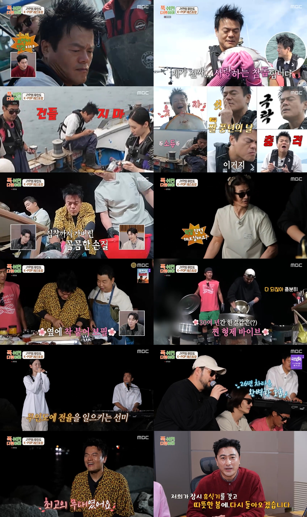 17일 방송된 73회에서는 박진영과 god 박준형·손호영·김태우, 선미가 무인도 레스토랑을 운영하고 달빛 아래 콘서트를 펼쳤다. 박진영은 직접 조업에 나서 참돔과 강담돔, 방어 등을 잡으며 열정적인 모습을 보였고, 즉석 회와 생선조림을 맛보며 “꿈꿨던 것 이상”이라며 행복해했다.