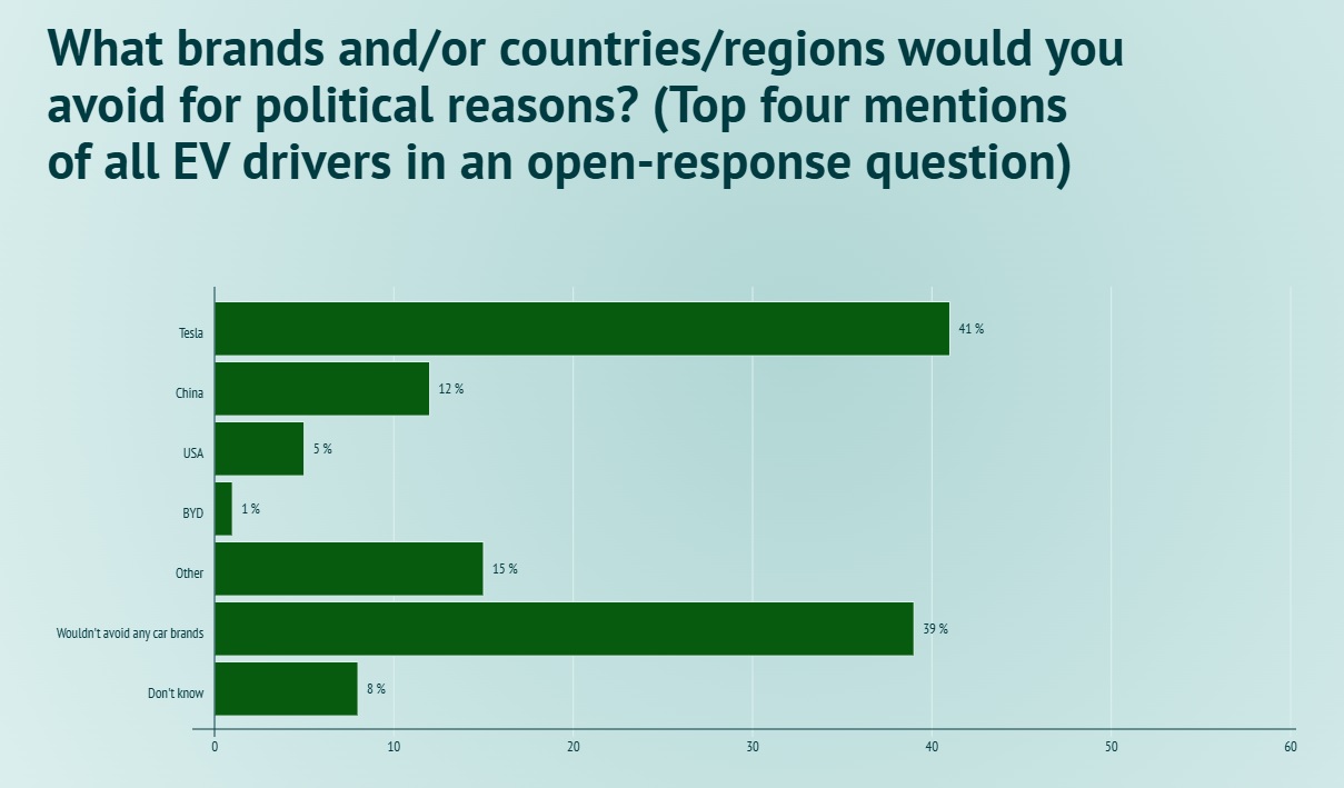 기피 브랜드나 생산국을 묻는 항목에서는 응답자의 41%가 테슬라를 꼽았다. 이어 12%가 중국산 전기차, 5%는 미국을 언급했다.