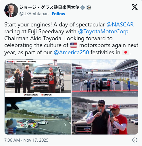 행사는 일본 자동차 비즈니스·문화협회가 주최한 NASCAR 관련 이벤트로 아키오 회장이 협회를 이끌고 있어 참석 자체는 자연스러운 일이었다.