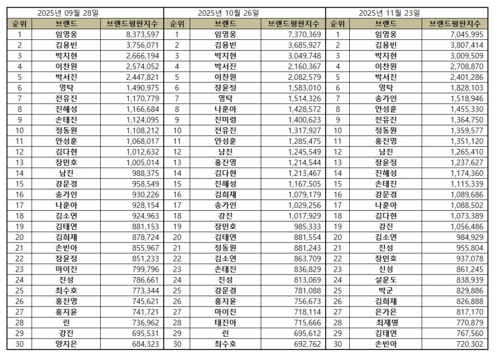 트로트 가수 브랜드평판 2025년 11월 빅데이터 분석결과, 1위 임영웅 2위 김용빈 3위 박지현 순으로 분석됐다.