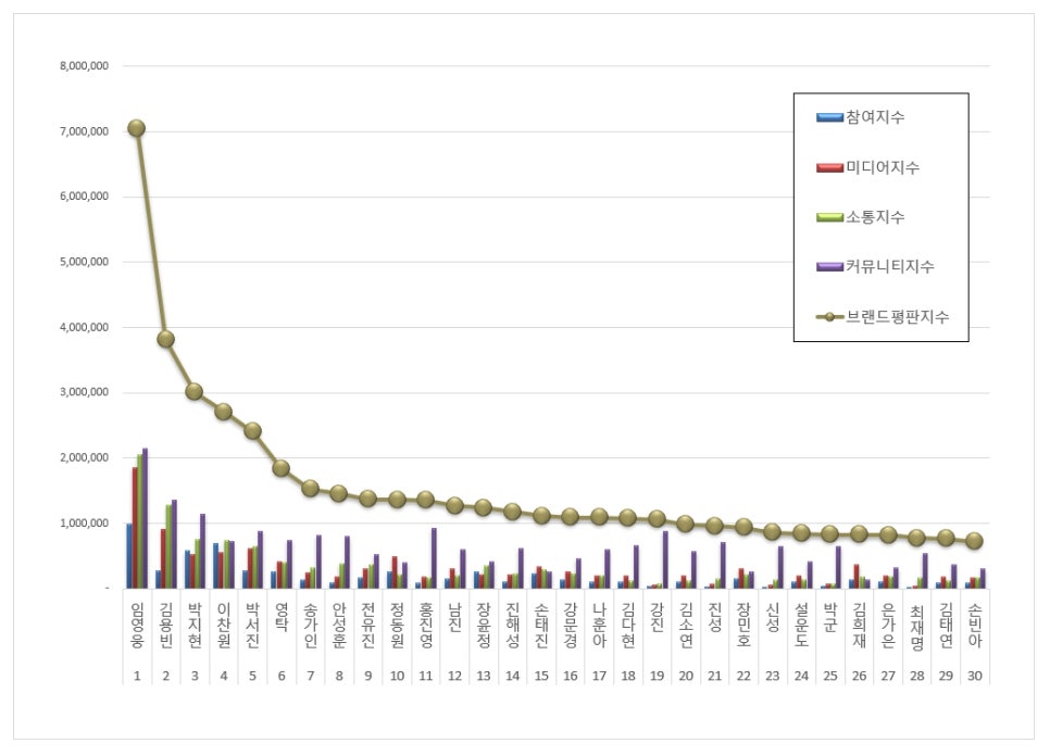 트로트 가수 브랜드평판 1위를 기록한 임영웅 브랜드는 참여지수 989,538 미디어지수 1,853,580 소통지수 2,056,714 커뮤니티지수 2,146,163이 되면서 브랜드평판지수 7,045,995로 분석됐다. 지난 10월 브랜드평판지수 7,370,369와 비교해보면 4.40% 하락했다.