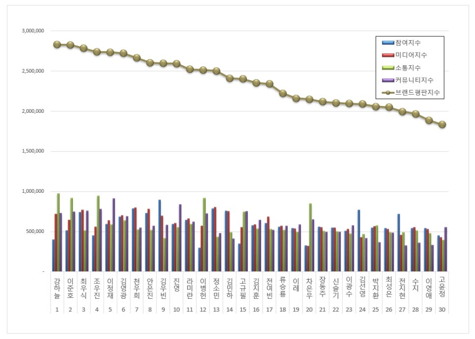 구창환 소장은 “브랜드소비, 이슈, 소통, 확산 모두 하락세를 보였다”며 “강하늘은 다양한 작품 활동으로 1위를 차지했고, 이준호는 드라마 ‘태풍상사’에서 활약하며 2위, 최우식은 로맨틱 코미디 인기로 3위를 기록했다”고 설명했다.