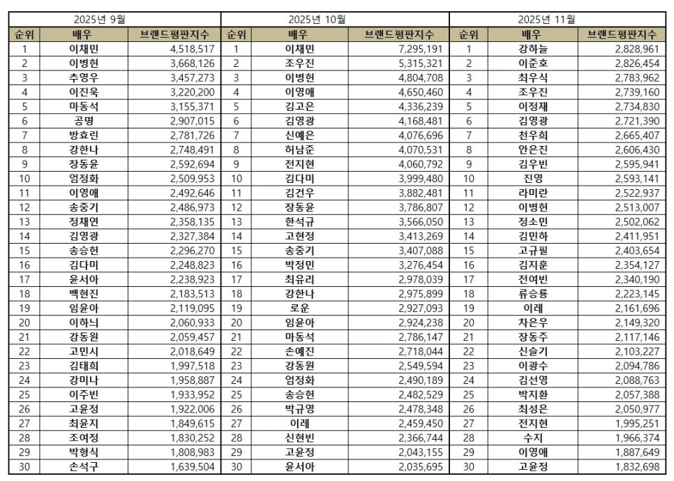 한국기업평판연구소가 2025년 11월 배우 브랜드평판을 발표했다. 조사 기간은 10월 25일부터 11월 25일까지로, 드라마·영화·OTT에 출연한 배우 100명을 대상으로 브랜드 빅데이터 1억4천여만 건을 분석했다. 지난달 대비 데이터 규모는 24.30% 줄었다.
