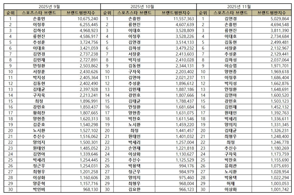 2위는 손흥민으로 469만여 점을 기록했다. 참여·미디어·소통·커뮤니티 지표는 고르게 나타났지만, 전월 대비 59.38% 하락해 순위 변동 폭이 컸다.