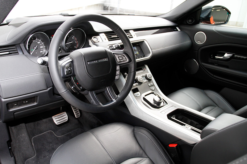 이보크 컨버터블의 실내 디자인은 선이 굵직 굵직하다. 재규어랜드로버가 그렇듯 사이드미러는 도어의 좌우버튼을 동시에 눌러 펴고 닫는다. 기어변속은 커다란 다이얼식 버튼을 이용한다. 아주 독특하면서도 직관적이다.