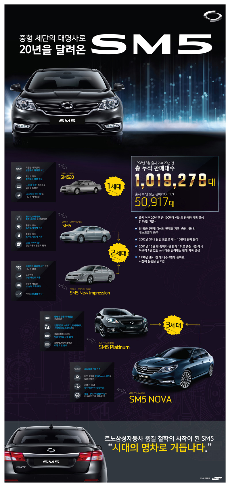 1998년 3월 출시된 SM5는 출시 첫 해부터 내수 판매 4만대 돌파 등 브랜드 설립 때부터 지금까지 꾸준히 판매가 이뤄지고 있는 베스트셀링 모델로 남다른 의미가 있는 차량이다.