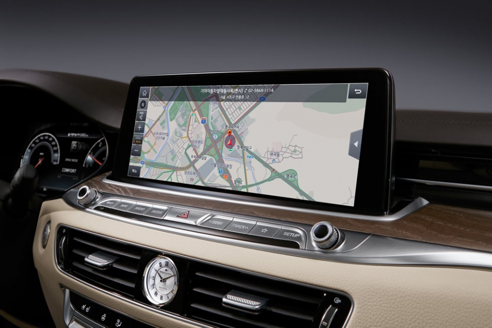 와이드하면서 시원한 모니터 화면에는 UVO 3.0 고급형 내비게이션이 탑재됐고 조향연동 카메라, 실시간 교통정보, 휴대폰 메모리 음악과 영상 등을 재생할 수 있다.