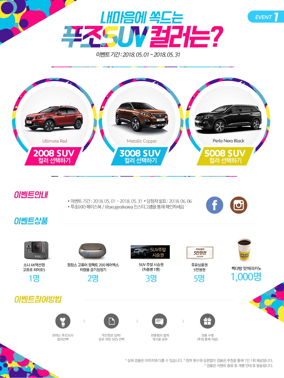 추첨을 통해 선발된 당첨자에게는 소니 4K 액션캠 고프로 히어로5(1명)를 비롯해 필립스 차량용 공기청정기(2명), 푸조 SUV 주말 시승권(3명), 주유상품권 5만원 권(5명), 아메리카노 기프티콘(1천명) 등 풍성한 선물을 제공한다. 당첨자 발표는 6월 6일(수)에 푸조 공식 페이스북과 인스타그램에서 확인 할 수 있다.